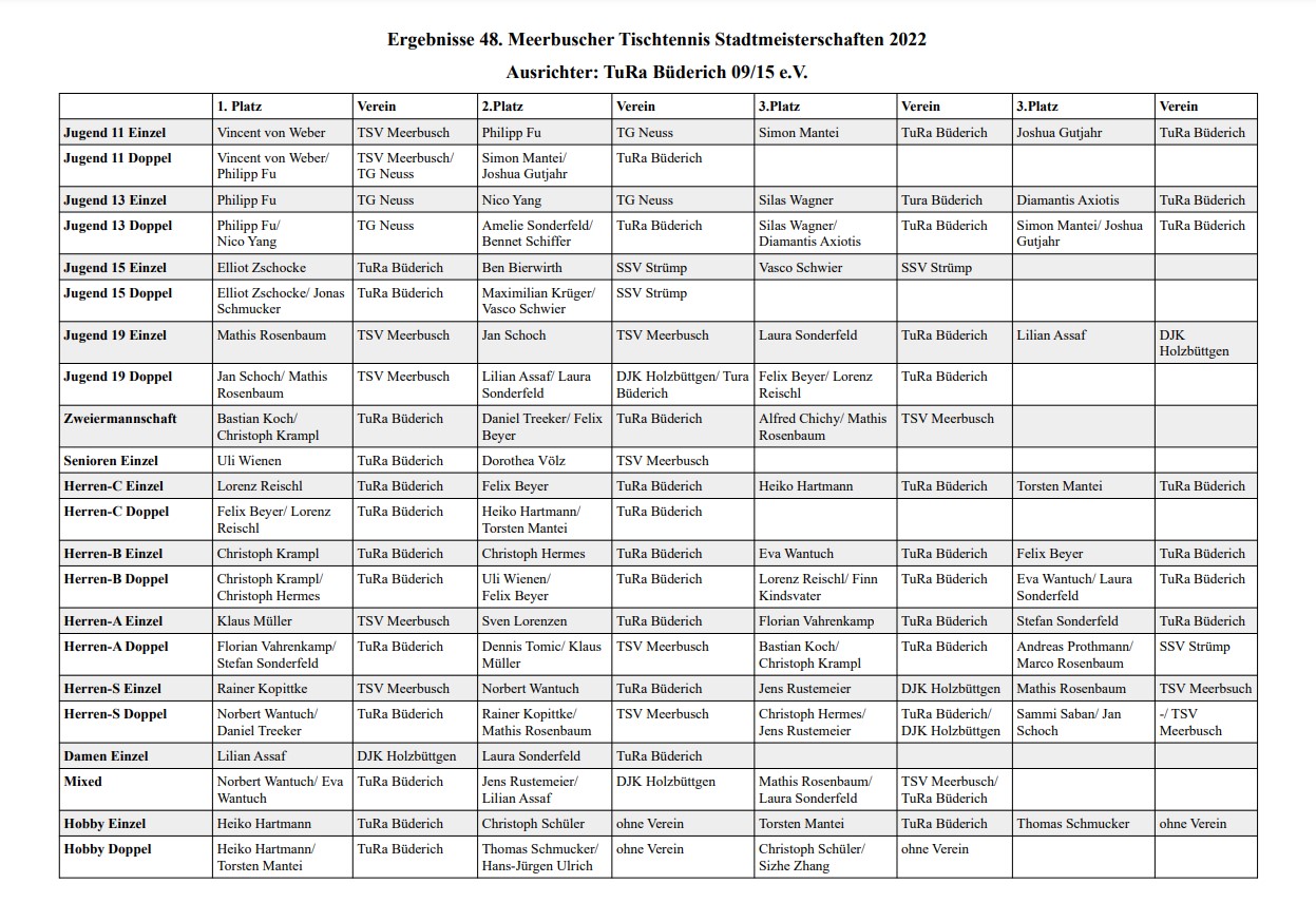 13.06.2022 - Die neuen Stadtmeister im Tischtennis heißen Lilian Assaf und Rainer Kopittke. Beide Spieler haben ihre Konkurrenzen im Rahmen der 48. Tischtennis Stadtmeisterschaft gewonnen, die der TURA BÜDERICH 09/15 E.V. vom 10. - 12.06.2022 ausgerichtet hat.