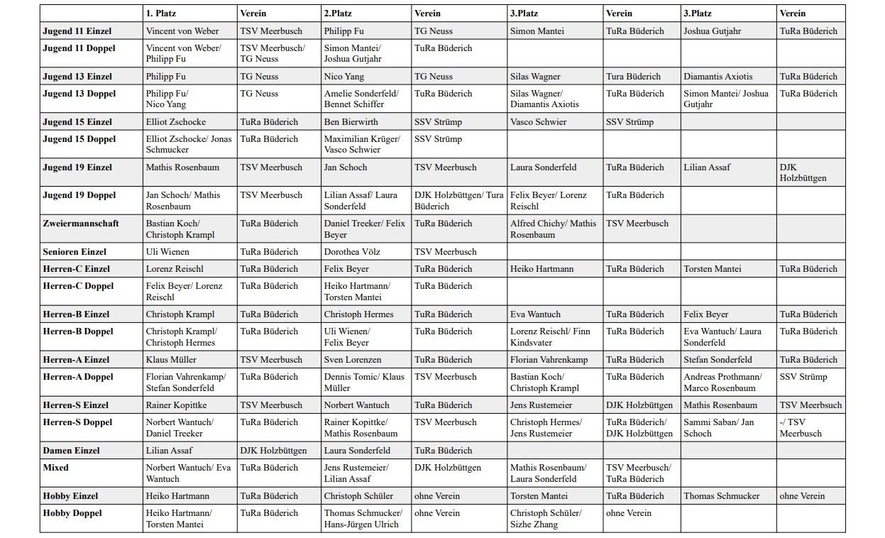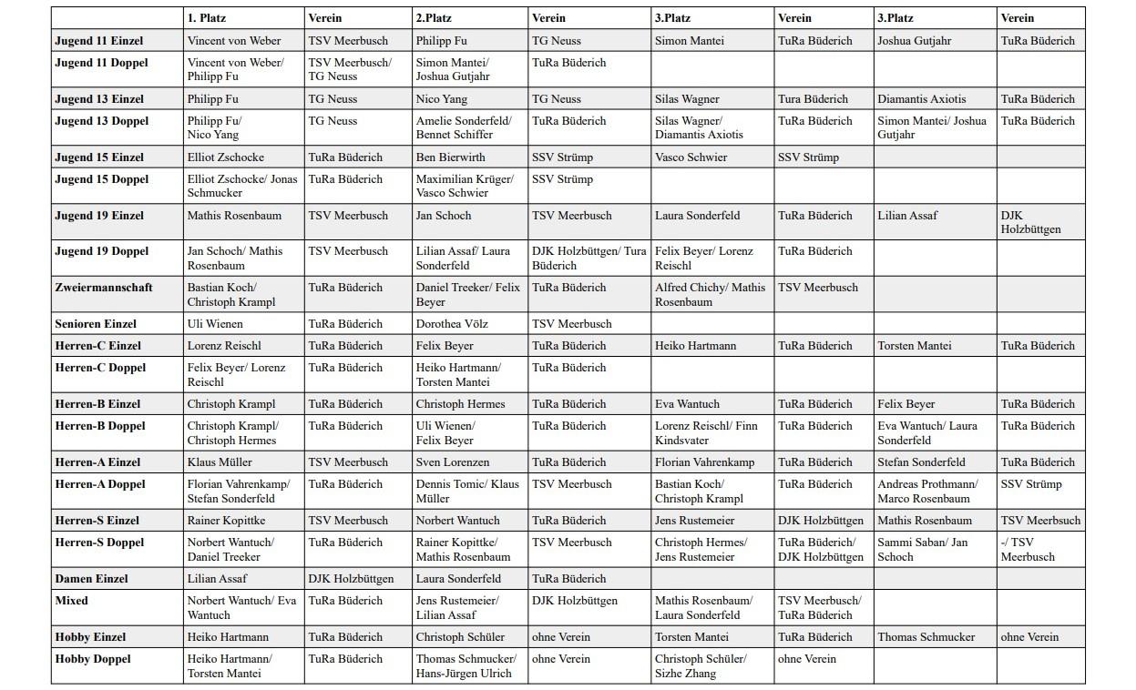 Im Herren-S Doppel konnten sich hingegen Wantuch/Treeker gegen Kopittke/Rosenbaum mit 3:1 nach Sätzen durchsetzen. Auch die Mixed-Konkurrenz entschied Norbert Wantuch zusammen mit seiner Frau Eva Wantuch. In den weiteren Herrenklassen konnten sich Klaus Müller vom TSV Meerbusch (Herren A), Christoph Kampl (Herren B), Lorenz Reischl (Herren C) und Ulli Wienen (Ü60) jeweils vom TURA BÜDERICH behaupten. In der gut besetzten Hobby-Klasse setzte sich Heiko Hartmann vor Christoph Schüler durch.