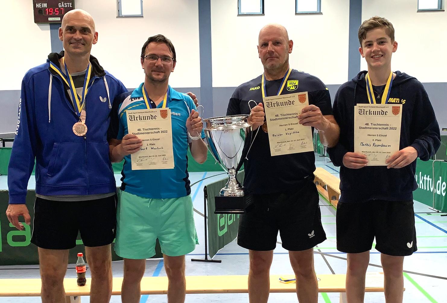Der mehrfache Sportler des Jahres, Rainer Kopittke vom TSV Meerbusch, behielt im Finale der Herren-S Konkurrenz gegen Norbert Wantuch vom TURA die Oberhand. Auf die 3. Plätze kamen Mathis Rosenbaum und Jens Rustemeier.