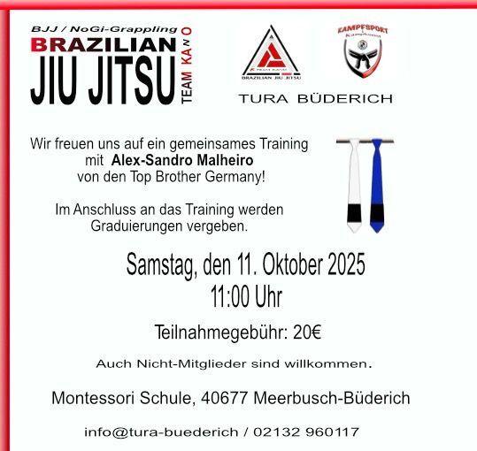 Am Samstag, den 11. Oktober 2025, lädt die Brazilian Jiu-Jitsu Gruppe von TURA BÜDERICH zu einem besonderen Training mit Alex-Sandro Malheiro (Top Brother Germany, 4. Dan) ein.